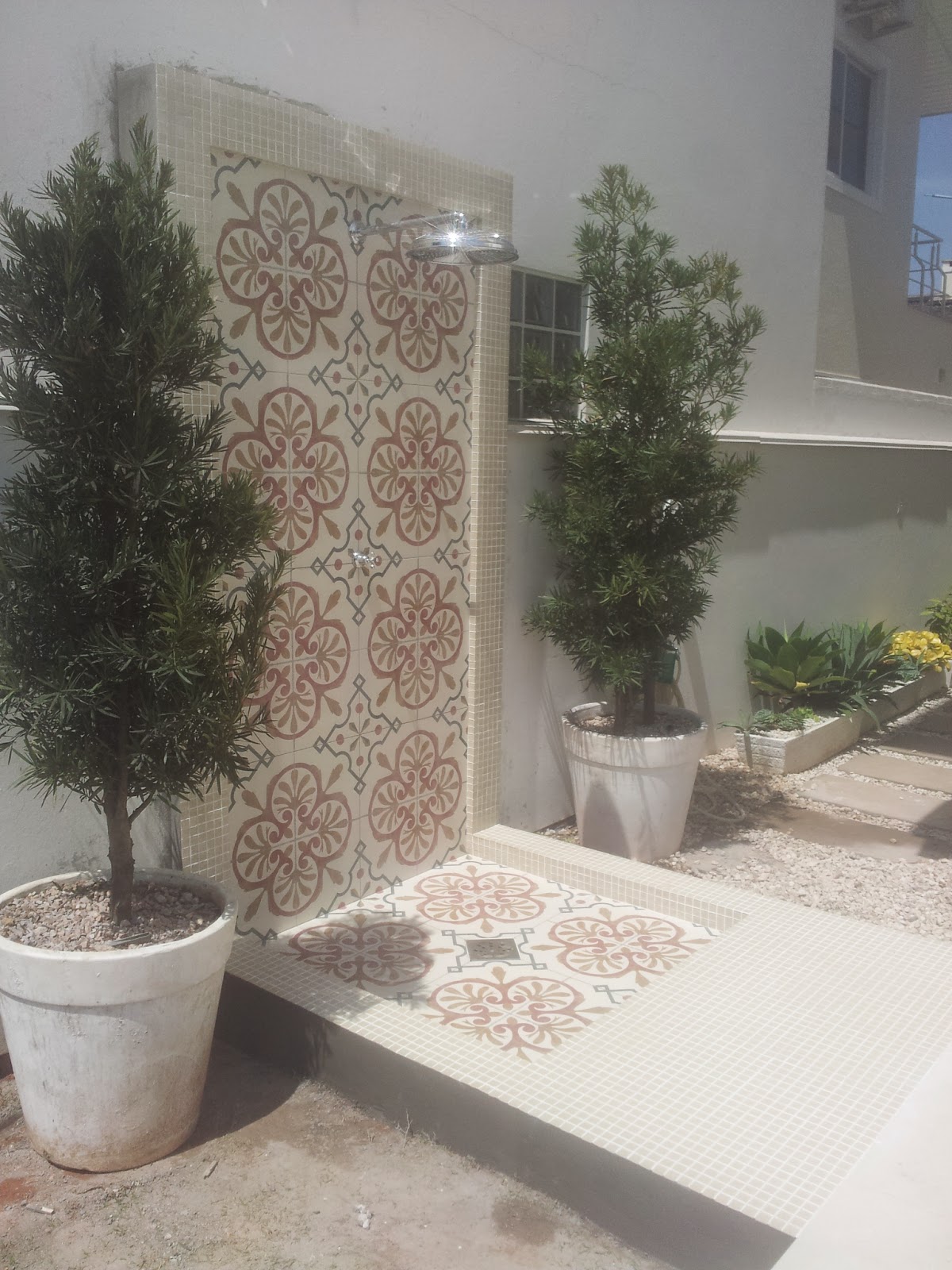 - Confecção de subida da ducha com porcelanato decorado no centro e bordas em pastilha de vidro.